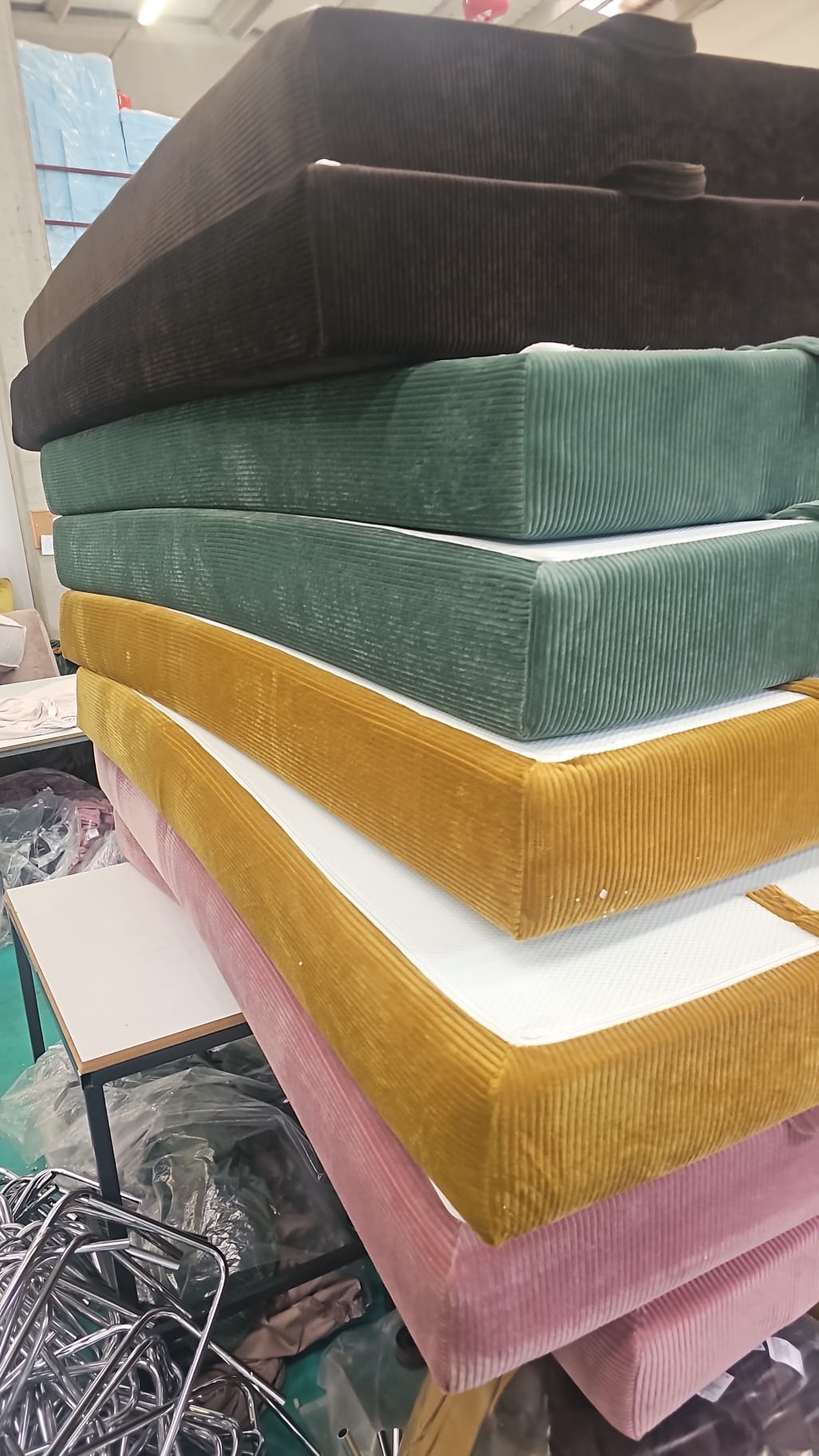 Once each piece is cut, sewn, and perfectly assembled, it’s time to get them travel-ready. Here, rows of finished cushions wait to be roll-packed, carefully stacked and organized to keep every shape crisp and protected. Each order is prepared with attention, ensuring that when it’s your sofa’s turn to ship, it’s handled with the same precision as the first stitch.